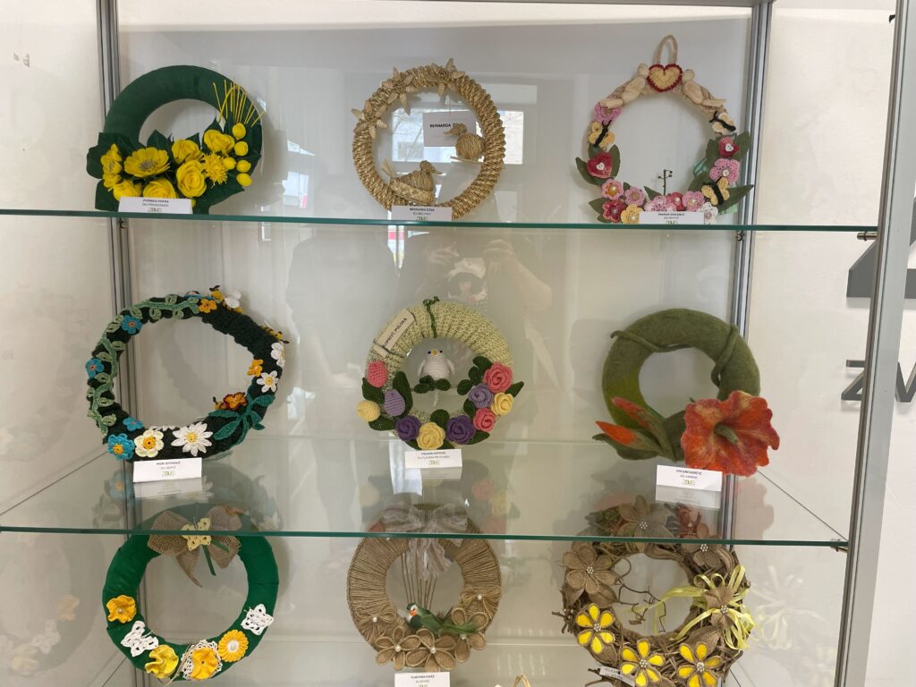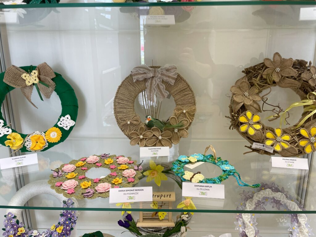 razstavljeni izbrani venčki krasijo vitrino na sedežu ZDUS.